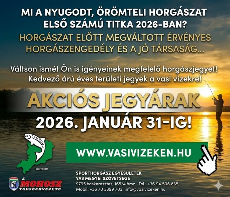 The silence of the Vásárlón waters and the closeness of nature await you this year as well. In the second week of January, ticket sales for 2026 will officially start. Despite the challenging economic situation, we have good news: you can purchase state fishing licenses, regional tickets and federal contributions at the same price in 2026. Thanks to the successful management of MOHOSZ and our Association, we can guarantee the usual standard and continuous fish stocking next year - for the third year in a row - without increasing the price of fishing licenses.