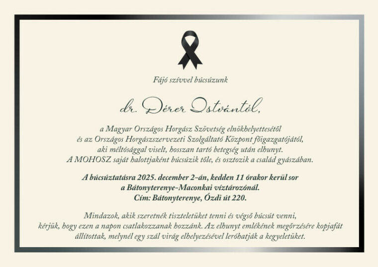 It is with deep sorrow and sympathy that we announce that Dr. István Dérer (1969–2025), Vice President of the Hungarian National Anglers' Association and Director General of the National Anglers' Association Service Center, has passed away with dignity after a long illness.