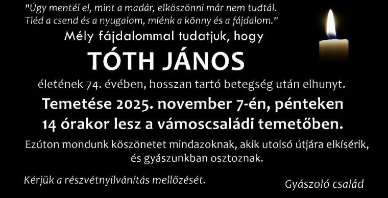 We were deeply shocked to learn that János Tóth, former president of the Répcelak City Miners' Fishing Association and former member of the Executive Committee of the Vas County Association of Sport Fishing Associations, has passed away at the age of 74.