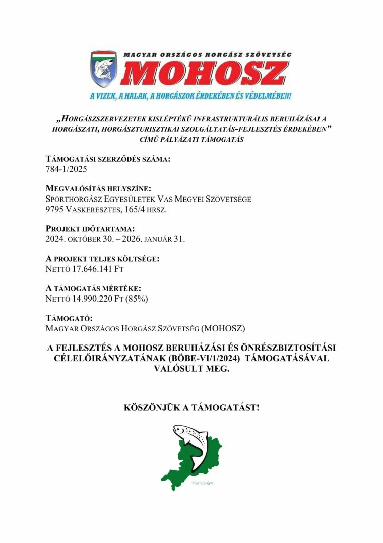 Felhívás/program neve: FM. - MOHOSZ - Halászati őrzéshez szükséges eszközbeszerzési támogatás